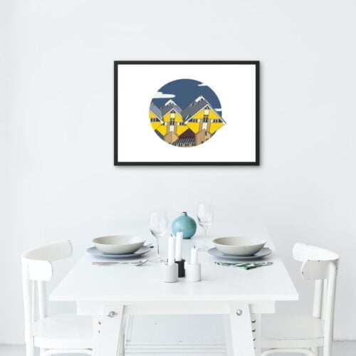 Deze poster heeft een strak design en is een echte blikvanger in je huis. Geel en blauw zijn de dominante kleuren van deze art print. Dominant klinkt misschien wat onaardig. Geen paniek, ik heb gebruik gemaakt van een lekker frisse gele kleur, niet zo’n schreeuwerige neon kleur. Het blauw van de lucht is lekker rustig. Én gemakkelijk te combineren met andere kunst.