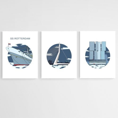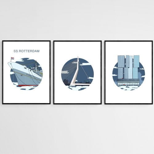 Rotterdam Poster set – set van 3 iconische posters – SS Rotterdam – de Erasmusbrug – De Rotterdam